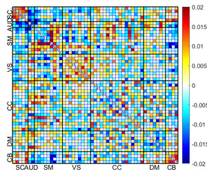 Fig. 16 displays the mean sFNC matrix of 25% of subjects with the lowest BHI among the total of 6922 test subjects. Conversely, Fig. 17 shows the mean sFNC matrix of 25% of subjects with the highest BHI among the same group of 6922 subjects for the same time points. Significantly, individuals displaying the highest BHI values exhibited enhanced connectivity in the SC and select regions of the SM. Conversely, participants with the lowest BHI values demonstrated heightened connectivity in the SM, VS, and SM-VS domain pairs. These observations obtained from the mean sFNC data of the UK Biobank study align with the regions identified through the calculation of reconstruction error.