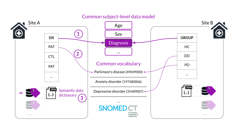 Limitations of standardized vocabularies: Neurobagel depends on existing standardized vocabularies that sites use to annotate their local data. For many data types like demographics, clinical diagnoses, and imaging modalities, excellent vocabularies exist. But the discovery pilot project also highlighted the limitations of even well-curated vocabularies like SNOMED-CT to capture the broad range of clinical assessments captured across sites. Addressing these limitations will likely require a community-led effort to collect and curate a list of published assessment instruments that are commonly used in a neuropsychological context, with links to terms in existing ontologies. A second, compatible solution is to enable a consortium like ENIGMA-PD to create its own internal vocabulary of assessments to use for harmonization among consortia sites. For neuroimaging pipelines, such vocabularies do not exist, so we created our own vocabulary of well-known pipeline names that served as a list of standardized terms (https://github.com/nipoppy/pipeline-catalog). We hope to expand this vocabulary into a community-maintained resource going forward.