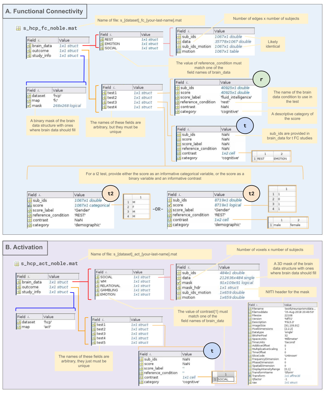 To support BrainEffeX as a growing resource, we welcome contributions of large publicly available fMRI datasets (n > 400). The minimum sample size of 400 subjects was chosen to reflect a balance between large sample size recommendations2 and feasibility. Data should be provided at the subject level, after preprocessing and computation of functional connectivity and/or task-based activation statistical maps. Specifically, a .mat file containing three structs should be provided, with fields listed in Figure 3. Note that for contributors who do not have access to MATLAB or prefer other languages, .mat files can be prepared with Scipy17 for Python or R.Matlab18 for R. Template .mat files with the proper structure for each test type may be downloaded from https://github.com/neuroprismlab/BrainEffeX/tree/main/for_contributors/templates to facilitate the organization of the data files. All fields are required, except where explicitly noted (i.e., allowing NaN). See https://github.com/neuroprismlab/BrainEffeX/tree/main/for_contributors/README.md for more details on formatting dataset contributions. If contributors do not have familiarity with, or access to, MATLAB, they should submit an issue on GitHub or contact the authors by email for assistance.