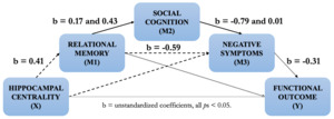 While functional outcome is the ultimate stage of this model, our goal is to systematically evaluate the contributions of hippocampal centrality to functioning through relational memory, social cognition, and negative symptoms, while taking into account potential moderating factors. It is also inspired from Rubin et al.,117 who theorized that successful social behaviour depends upon constant encoding, updating, and flexible manipulation of relational memory representations via the hippocampus. Our model unites and extends theories of the hippocampal system and notably integrates cortical connectivity, since complex information processing relies on the coordinated performance of multiple brain regions or networks. We set out to test the overall model, for which each component was derived from our prior findings, for the first time.