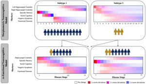 We need to consider two main limitations of the proposed study. First, our proposed model of psychosis does not necessarily provide a comprehensive model of psychosis overall. More precisely, we focus on cognitive components of psychosis, their potential foundation in the hippocampus, and their impact on negative symptoms and functioning. We acknowledge that this model does not consider positive symptoms or other neurodevelopmental factors contributing to psychosis. Second, the machine learning approach is based on monotonous modeling of the illness. SuStaIn was first developed in neurodegenerative illness, where a consistent decline of considered variables is innate to the disease. In this context, the algorithm was developed to model progression patterns under the assumptions that markers deteriorate but do not necessarily improve. This assumption is challenged by the episodic nature of mood and psychotic illness and, depending on the marker, might not be suitable to fully capture the progression of the illness. As our work is amongst the first to consider SuStaIn in a multiscale context of mental illness, these findings will nevertheless assist in defining patterns of illness severity across the variables of our model in the sample, and contribute to the interpretation SuStaIn in psychosis and its current limitations in mental illness. As all code will be made publicly available, our framework will allow for external researchers to contribute to the algorithm to better meet the reality of disease dynamics in psychiatric illness.