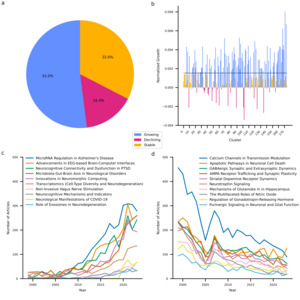 Consequently, there is an urgent need to provide a high-level perspective on the evolving landscape of neuroscience. New methods of information curation are required both to integrate the field and to understand the dynamics driving a major area of human intellectual endeavor. Addressing this necessity, I have compiled an extensive dataset of neuroscientific abstracts and their metadata spanning from 1999 to 2023 from Q1 and Q2 journals in the respective years according to the SCImago Country & Journal Rank (SJR) database.22 Utilizing state-of-the-art text embedding and clustering techniques as a model for future large-scale bibliographic synthesis, I categorized the literature into 175 distinct research clusters, enabling a content-driven examination of the field’s dynamic trajectory over the past 25 years.