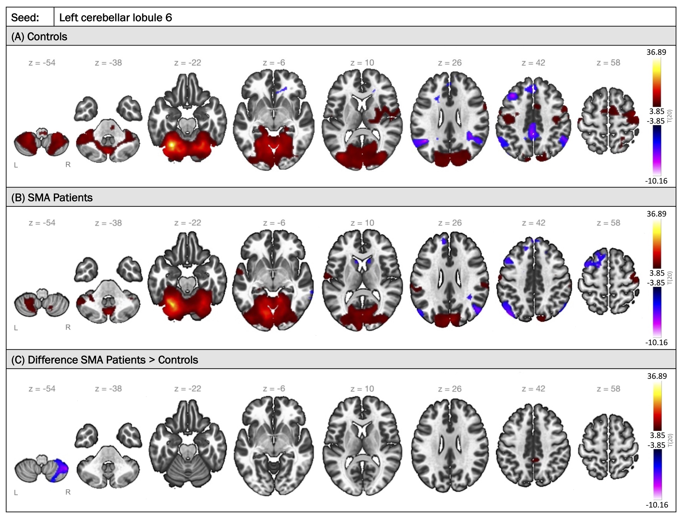 While this study provides important insights into rsFC in SMA, several limitations need to be acknowledged. First, the cross-sectional design of the study limits the ability to track changes in FC over time, which would be valuable for understanding temporal patterns of brain network alterations in SMA. Furthermore, participants with SMA were primarily recruited from tertiary care pediatric and adult neuromuscular clinics, which could introduce selection bias. However, with the advent of disease-modifying therapies, most SMA patients are now followed in these specialized clinics. Although we did ensure that all peer controls were age-matched to the SMA group, the inclusion of participants across a wide age range (from 7 to 40 years) may mask age-specific changes in brain connectivity. Our cohort was also heterogeneous in terms of SMA type, disease duration, and treatment status (age at treatment and type(s) of therapies received). Since the effects of disease-modifying therapies on FC are not well understood, this variability may confound our results. Additionally, the rates of macrostructural brain abnormalities differed between the SMA and control groups,3 potentially influencing fMRI data acquisition and interpretation. However, the analysis pipeline was designed to mitigate the effects of structural differences on FC measurements, and previous studies have indicated limited concordance between anatomical and FC changes.53 Although brain fMRIs were acquired on two different scanners (Montreal and Calgary), we had SMA patients and peer controls at both sites and therefore data harmonization was not required. We also statistically controlled for site in all rsFC analyses. Our choice of a relatively short (5-minute) rs-fMRI sequence and slightly larger voxels (3.6 mm isotropic) was driven by the need to maximize participant comfort and tolerability. As this was a multimodal imaging acquisition session, each sequence was optimized to be as brief as possible to enable acquisition of additional modalities while maintaining maximal brain coverage and signal-to-noise ratio. Future studies could use smaller voxel sizes to achieve higher spatial resolution as well as longer sequence durations to maximize reliability.54 However, in the present study, shorter sequences were sufficient to achieve good data quality, particularly given that some participants were children with moderate-to-severe motor impairments who were required to remain motionless in a potentially uncomfortable supine position, where longer acquisitions would be more likely to increase motion and degrade data quality. We also elected not to apply extremely stringent denoising approaches (e.g., using the 24-parameter Friston model) to reduce the possibility of regressing out neural signal, reduce loss of degrees of freedom in our model, and prevent potential over-regression. Given the low levels of head motion in our sample, a 12-parameter head motion model (six translational and rotational components plus their first-order derivatives) was deemed sufficient. Nevertheless, subsequent studies could apply more stringent parameters to confirm our findings. Additionally, data were upsampled from 3.6 mm to 2 mm voxels during preprocessing. While this degree of up sampling has been reported to potentially increase false-positive rates in cluster-extent inference, this remains an area of ongoing research, and its impact on the present findings is uncertain.55–57 Lastly, clinical measures of cerebellar function, cognition, behavior, language, and emotion were not included in this study. Future prospective research using larger, longitudinal cohorts are needed to validate our findings and explore dynamic changes in FC over time and their relationship with non-motor outcomes in SMA.