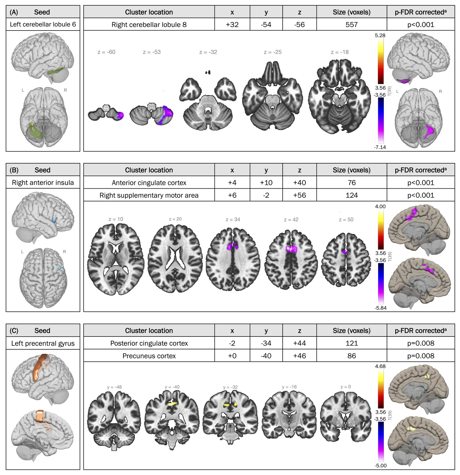 Functional and anatomical data were preprocessed using a flexible preprocessing pipeline21 including realignment with correction of susceptibility distortion interactions, outlier detection, direct segmentation and Montreal Neurological Institute (MNI) space normalization, and smoothing. Functional data were realigned using Statistical Parametric Mapping (SPM) realign & unwarp procedure,22 where all scans were co-registered to a reference image (first scan of the first session) using a least squares approach and a 6 parameter (rigid body) transformation,23 and resampled using b-spline interpolation to correct for motion and magnetic susceptibility interactions. Potential outlier scans were identified using Artifact Detection Tools24 as acquisitions with framewise displacement above 0.9 mm or global BOLD signal changes above 5 standard deviations,25 and a reference BOLD image was computed for each participant by averaging all scans excluding outliers. Only one participant had more than 50 outlier volumes out of 150 total volumes (mean 5.3 outliers, standard deviation 12.9; range 0-68), thus retaining at least 100 volumes for all but one participant. Excluding this participant from the seed-to-voxel analyses yielded similar results, with all seed-cluster pairs showing significant group differences in the original analysis remaining significant. Functional and anatomical data were normalized into standard MNI space, segmented into grey matter, white matter, and cerebrospinal fluid (CSF) tissue classes, and resampled to 2 mm isotropic voxels following a direct normalization procedure25 using SPM unified segmentation and normalization algorithm26 with the default IXI-549 tissue probability map template. Last, functional data were smoothed using spatial convolution with a Gaussian kernel of 8 mm full width half maximum.